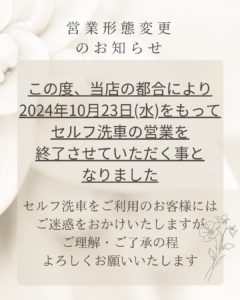 いつも当店をご利用いただきまして誠にありがとうございます。 突然ではございますが、2024年10月23日(水)をもちまして当店のセルフ洗車場の営業を終了いたします。 お客様には大変ご迷惑をおかけしますが、ご理解・ご了承の […]