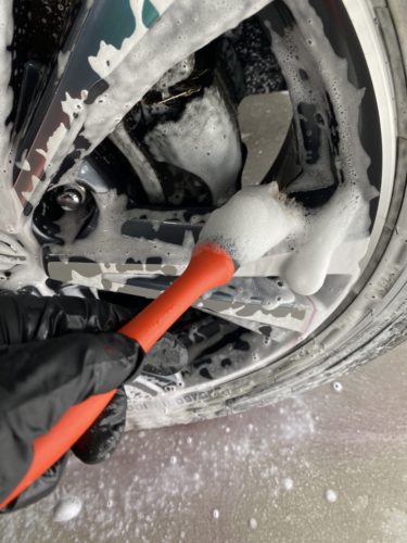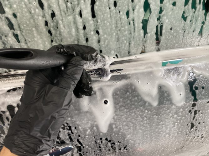 プレウォッシュや細部洗浄を行い、表面の汚れを落としていきます。